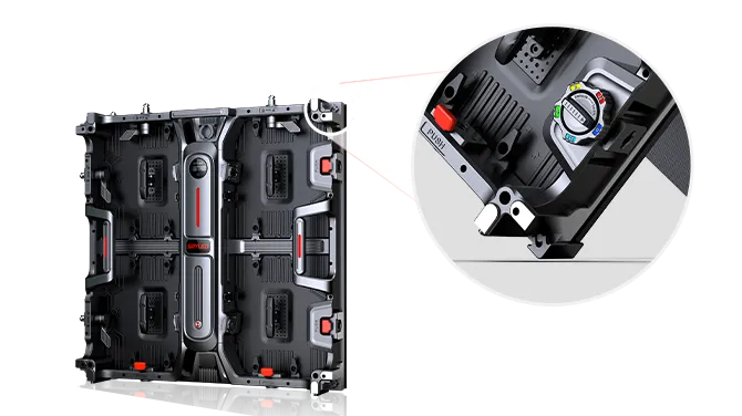 The rental LED display screen module features quick locking, curved locking, and anti-collision devices to ensure easy and safe installation.