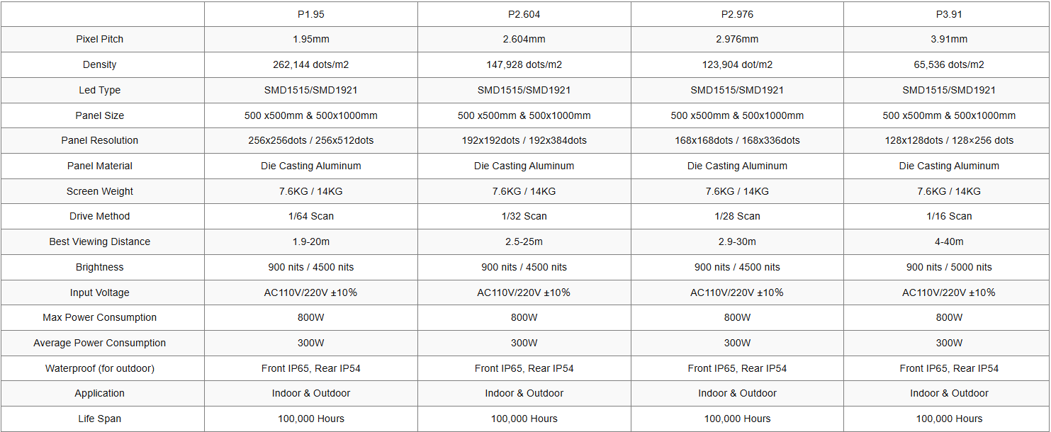 Available pixel pitches include: P2.604, P2.976, P3.91, P4.81, etc. These options allow you to select the most appropriate resolution based on viewing distance and clarity requirements.